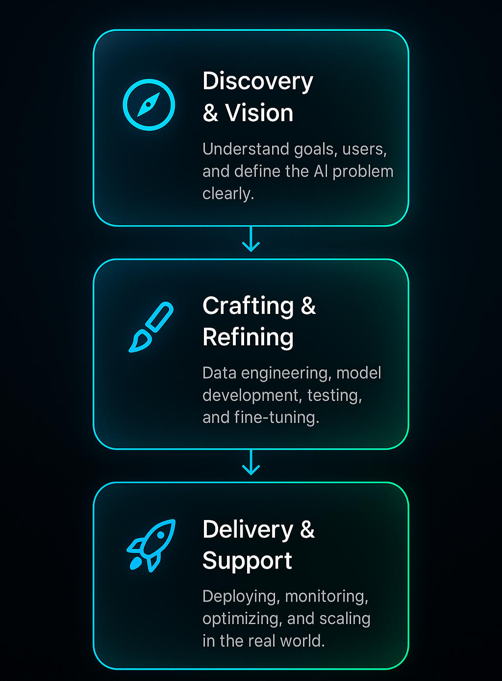 The process begins with deep listening to understand challenges and aspirations. Working together to clarify objectives, identify opportunities, and envision how AI can create meaningful impact for users and business. This foundation ensures the focus remains on building something that truly matters.